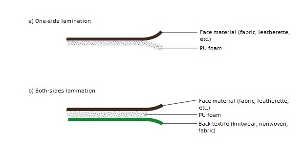 Production of layered materials in a metre, which includes a layer of PU foam. The PU foam is flame-moulded and then bonded to another substrate between the rollers of the line. The foam melt acts as an adhesive. The passage through the line allows simultaneous double-sided lay-up.